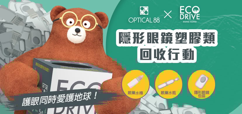 香港每年大約有 2,100 噸塑膠被丟棄到堆填區,對環境同生態造成嚴重破壞。OPTICAL 88 今次與 EcoDrive Hong Kong 合作,回收眼藥水樽、眼藥水瓶及隱形眼鏡包裝,實行循環再造,護眼同時愛護地球!